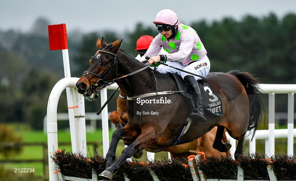14 November 2021; Sharjah, with Patrick Mullins up, jumps the last on their way to winning the Unibet Morgiana Hurdle during day two of the Punchestown Winter Festival at Punchestown Racecourse in Kildare. Photo by Seb Daly/Sportsfile