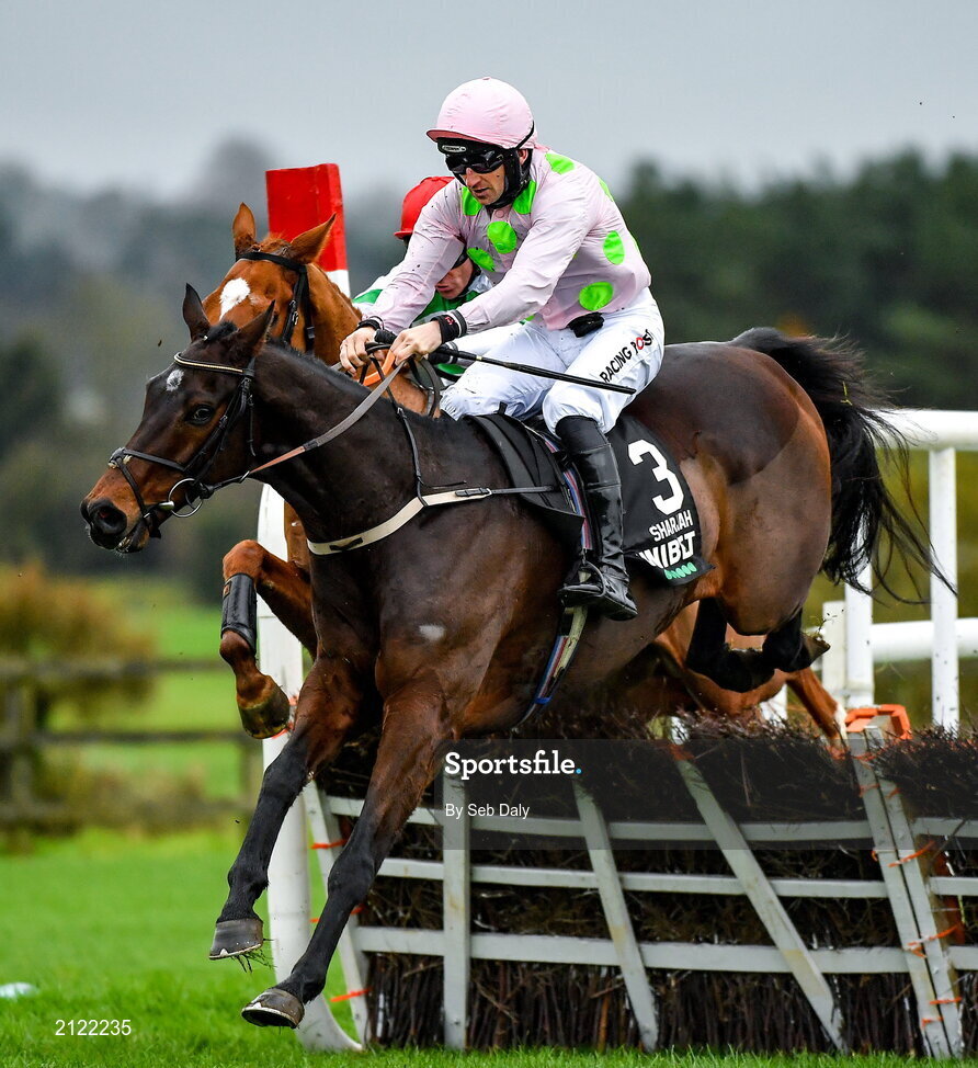 14 November 2021; Sharjah, with Patrick Mullins up, jumps the last on their way to winning the Unibet Morgiana Hurdle during day two of the Punchestown Winter Festival at Punchestown Racecourse in Kildare. Photo by Seb Daly/Sportsfile