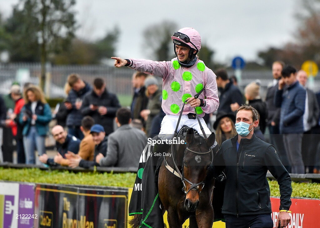 14 November 2021; Jockey Patrick Mullins celebrates as he enters the winners enclosure after riding Sharjah to victory in the Unibet Morgiana Hurdle during day two of the Punchestown Winter Festival at Punchestown Racecourse in Kildare. Photo by Seb Daly/Sportsfile