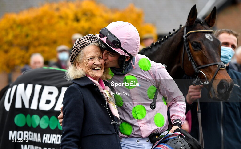 14 November 2021; Jockey Patrick Mullins kisses his grandmother Maureen Mullins after riding Sharjah to victory in the Unibet Morgiana Hurdle during day two of the Punchestown Winter Festival at Punchestown Racecourse in Kildare. Photo by Seb Daly/Sportsfile
