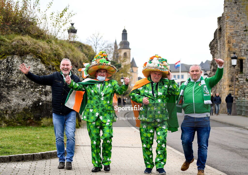 14 November 2021; Republic of Ireland supporters, from left, Stephen Burke, Frankie Moran, Bobby Cunningham and Alan Burke in Luxembourg before the FIFA World Cup 2022 qualifying group A match between Luxembourg and Republic of Ireland at Stade de Luxembourg in Luxembourg. Photo by Stephen McCarthy/Sportsfile