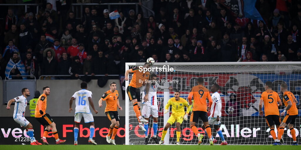 14 November 2021; Shane Duffy of Republic of Ireland contests a cross with Vahid Selimovic of Luxembourg during the FIFA World Cup 2022 qualifying group A match between Luxembourg and Republic of Ireland at Stade de Luxembourg in Luxembourg. Photo by Stephen McCarthy/Sportsfile