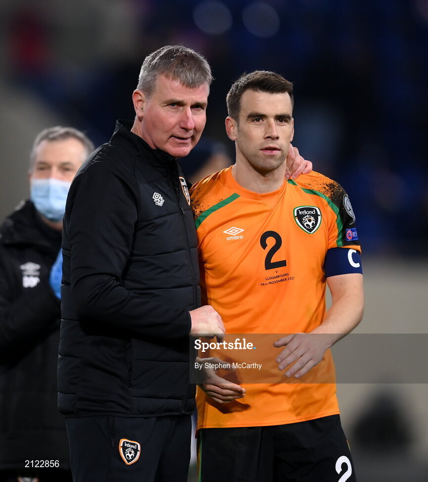 14 November 2021; Republic of Ireland manager Stephen Kenny with Seamus Coleman of Republic of Ireland after the FIFA World Cup 2022 qualifying group A match between Luxembourg and Republic of Ireland at Stade de Luxembourg in Luxembourg. Photo by Stephen McCarthy/Sportsfile
