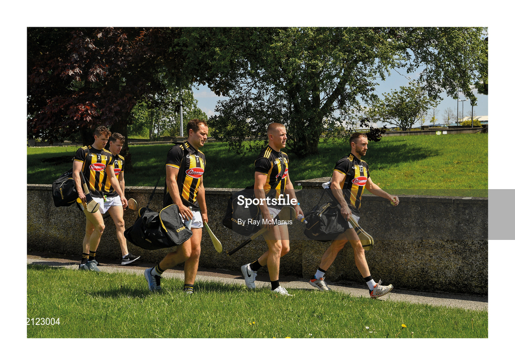 30 May 2021; All togged out – apart from the boots – and somewhere to go. Conor Fogarty, right, leads his Kilkenny team-mates Conor Browne, Pádraig Walsh, TJ Reid and Huw Lawlor along O’Loughlin Road en route to Nowlan Park. Photo by Ray McManus/Sportsfile This image may be reproduced free of charge when used in conjunction with a review of the book "A Season of Sundays 2020". All other usage © Sportsfile
