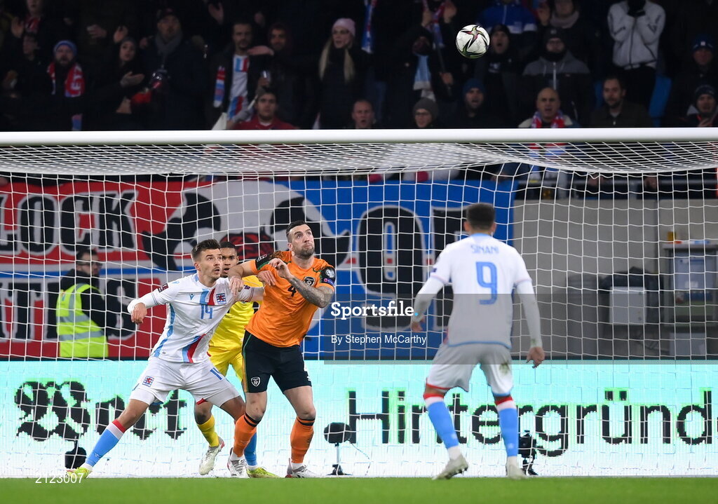 14 November 2021; Shane Duffy of Republic of Ireland is fouled by Maurice Deville of Luxembourg in the build-up to a goal which was subsequently disallowed during the FIFA World Cup 2022 qualifying group A match between Luxembourg and Republic of Ireland at Stade de Luxembourg in Luxembourg. Photo by Stephen McCarthy/Sportsfile