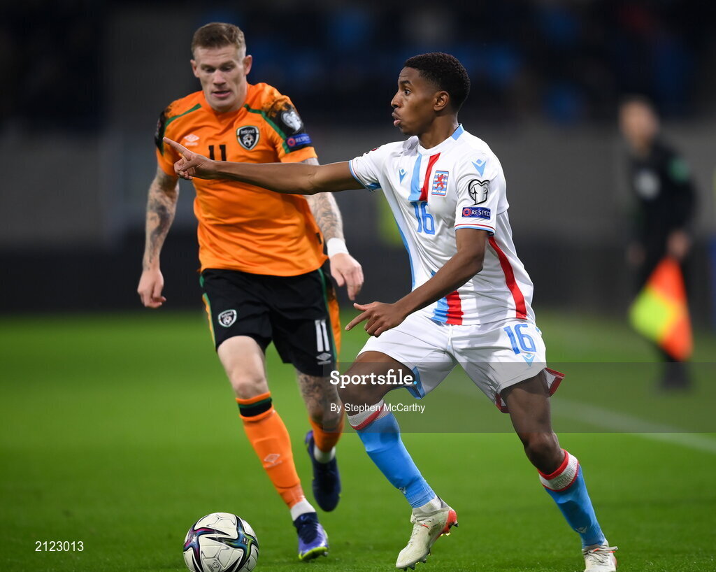 14 November 2021; Leandro Barreiro of Luxembourg in action against James McClean of Republic of Ireland during the FIFA World Cup 2022 qualifying group A match between Luxembourg and Republic of Ireland at Stade de Luxembourg in Luxembourg. Photo by Stephen McCarthy/Sportsfile