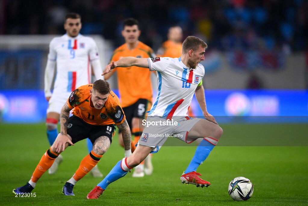 14 November 2021; Laurent Jans of Luxembourg in action against James McClean of Republic of Ireland during the FIFA World Cup 2022 qualifying group A match between Luxembourg and Republic of Ireland at Stade de Luxembourg in Luxembourg. Photo by Stephen McCarthy/Sportsfile