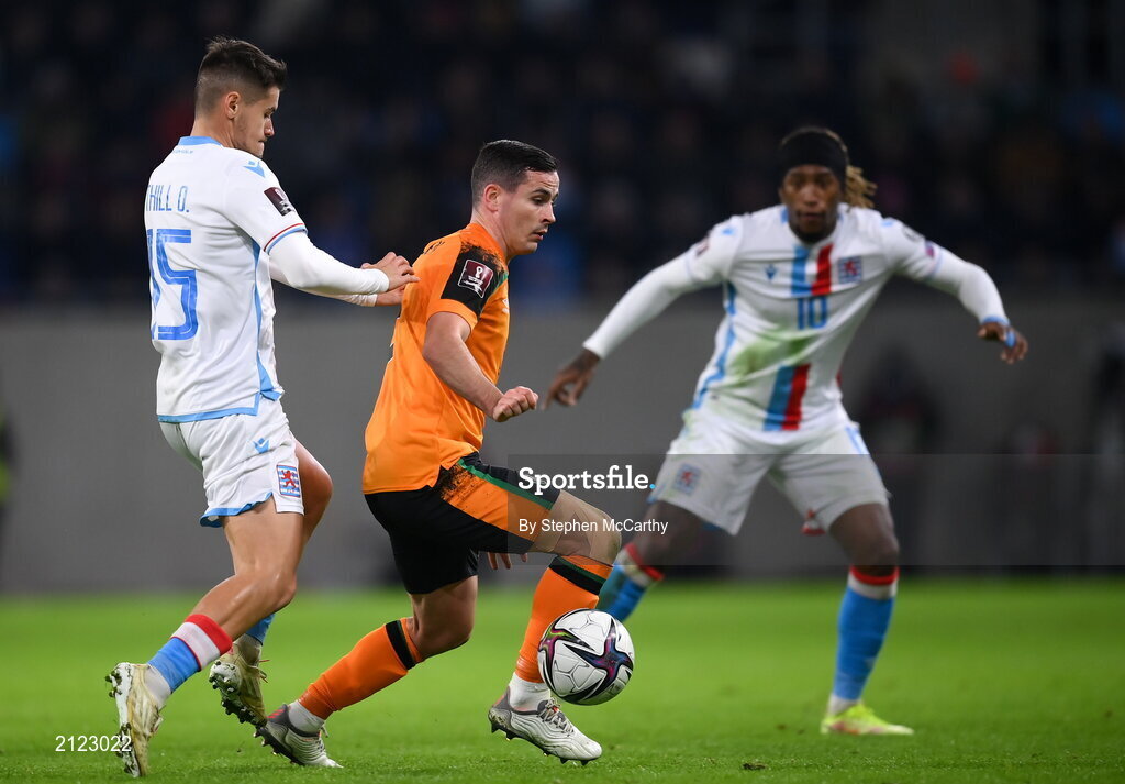 14 November 2021; Josh Cullen of Republic of Ireland in action against Olivier Thill, left, and Gerson Rodrigues of Luxembourg during the FIFA World Cup 2022 qualifying group A match between Luxembourg and Republic of Ireland at Stade de Luxembourg in Luxembourg. Photo by Stephen McCarthy/Sportsfile