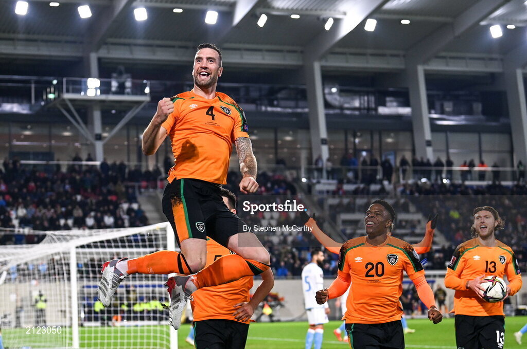 14 November 2021; Shane Duffy of Republic of Ireland celebrates after scoring his side's first goal during the FIFA World Cup 2022 qualifying group A match between Luxembourg and Republic of Ireland at Stade de Luxembourg in Luxembourg. Photo by Stephen McCarthy/Sportsfile