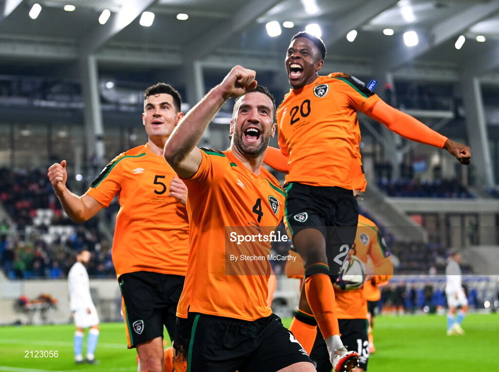14 November 2021; Shane Duffy of Republic of Ireland celebrates after scoring his side's first goal during the FIFA World Cup 2022 qualifying group A match between Luxembourg and Republic of Ireland at Stade de Luxembourg in Luxembourg. Photo by Stephen McCarthy/Sportsfile