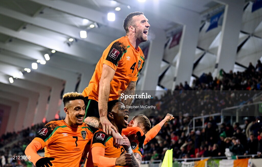 14 November 2021; Chiedozie Ogbene of Republic of Ireland celebrates with team-mates Callum Robinson, left, and Shane Duffy, centre, after scoring his side's second goal during the FIFA World Cup 2022 qualifying group A match between Luxembourg and Republic of Ireland at Stade de Luxembourg in Luxembourg. Photo by Stephen McCarthy/Sportsfile