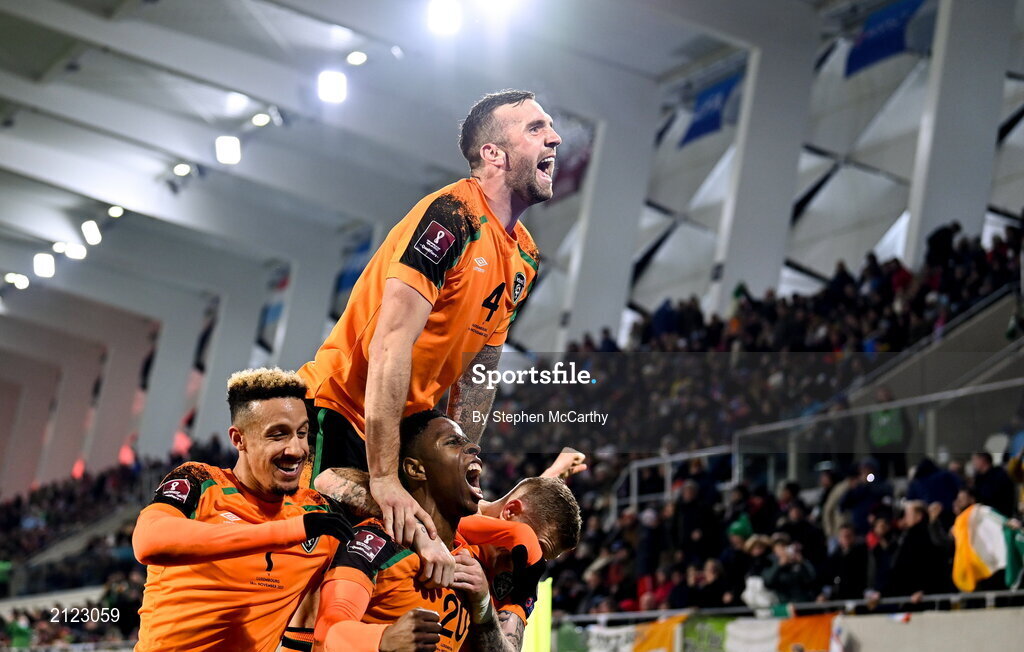 14 November 2021; Chiedozie Ogbene of Republic of Ireland, centre, celebrates with team-mates Callum Robinson, left, and Shane Duffy, top, after scoring their side's second goal during the FIFA World Cup 2022 qualifying group A match between Luxembourg and Republic of Ireland at Stade de Luxembourg in Luxembourg. Photo by Stephen McCarthy/Sportsfile