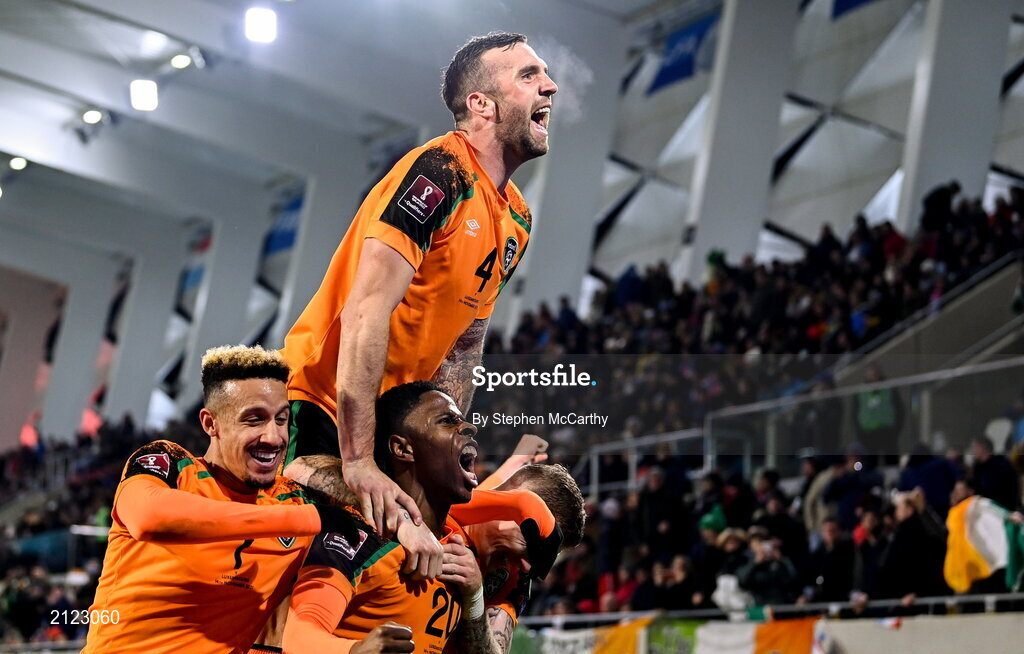 14 November 2021; Chiedozie Ogbene of Republic of Ireland celebrates with team-mates Callum Robinson, left, and Shane Duffy, centre, after scoring his side's second goal during the FIFA World Cup 2022 qualifying group A match between Luxembourg and Republic of Ireland at Stade de Luxembourg in Luxembourg. Photo by Stephen McCarthy/Sportsfile
