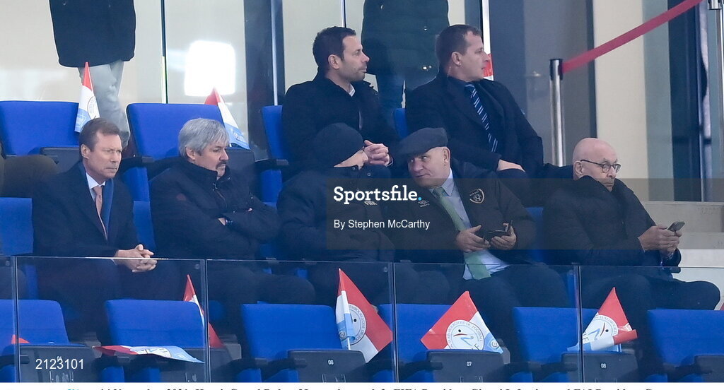 14 November 2021; Henri, Grand Duke of Luxembourg, left, FIFA President Gianni Infantino and FAI President Gerry McAnaney, second from right, during the FIFA World Cup 2022 qualifying group A match between Luxembourg and Republic of Ireland at Stade de Luxembourg in Luxembourg. Photo by Stephen McCarthy/Sportsfile