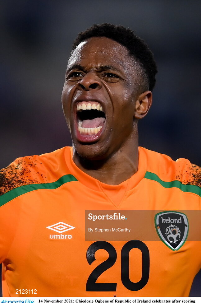 14 November 2021; Chiedozie Ogbene of Republic of Ireland celebrates after scoring his side's second goal during the FIFA World Cup 2022 qualifying group A match between Luxembourg and Republic of Ireland at Stade de Luxembourg in Luxembourg. Photo by Stephen McCarthy/Sportsfile