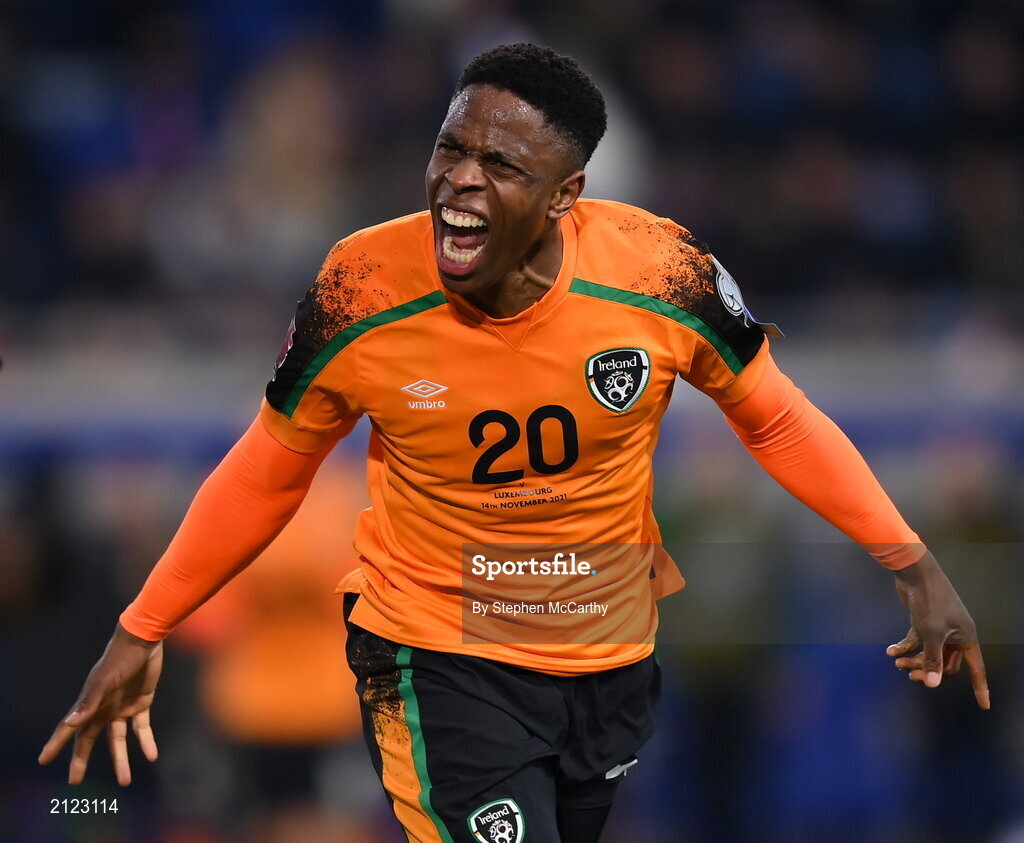 14 November 2021; Chiedozie Ogbene of Republic of Ireland celebrates after scoring his side's second goal during the FIFA World Cup 2022 qualifying group A match between Luxembourg and Republic of Ireland at Stade de Luxembourg in Luxembourg. Photo by Stephen McCarthy/Sportsfile