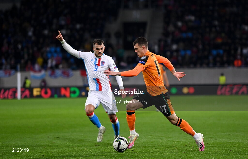 14 November 2021; Jason Knight of Republic of Ireland in action against Danel Sinani of Luxembourg during the FIFA World Cup 2022 qualifying group A match between Luxembourg and Republic of Ireland at Stade de Luxembourg in Luxembourg. Photo by Stephen McCarthy/Sportsfile