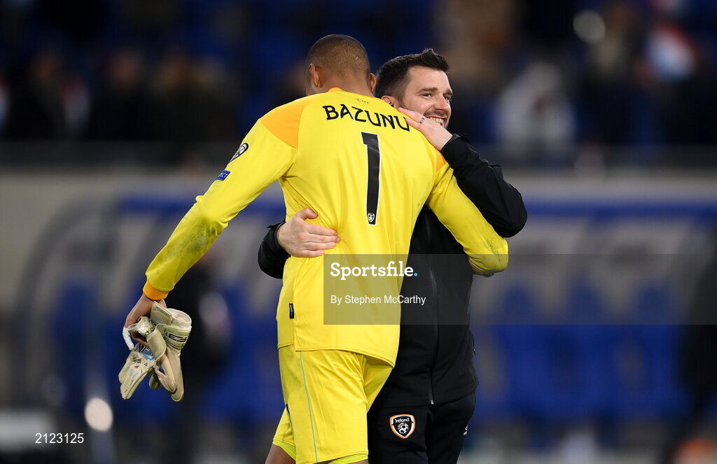 14 November 2021; Republic of Ireland chartered physiotherapist Kevin Mulholland with goalkeeper Gavin Bazunu following the FIFA World Cup 2022 qualifying group A match between Luxembourg and Republic of Ireland at Stade de Luxembourg in Luxembourg. Photo by Stephen McCarthy/Sportsfile