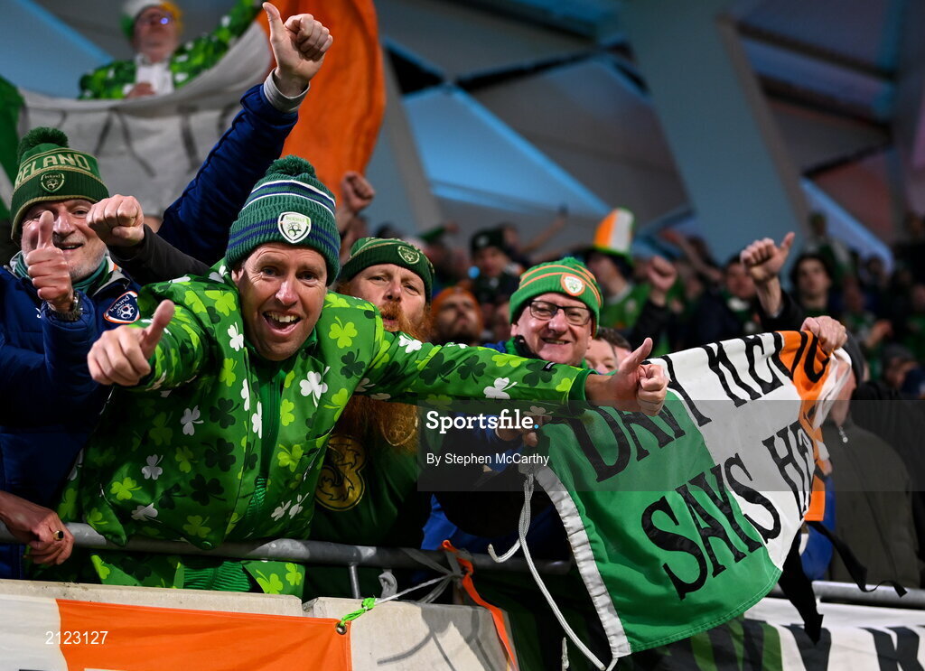 14 November 2021; Republic of Ireland supporters celebrate during the FIFA World Cup 2022 qualifying group A match between Luxembourg and Republic of Ireland at Stade de Luxembourg in Luxembourg. Photo by Stephen McCarthy/Sportsfile