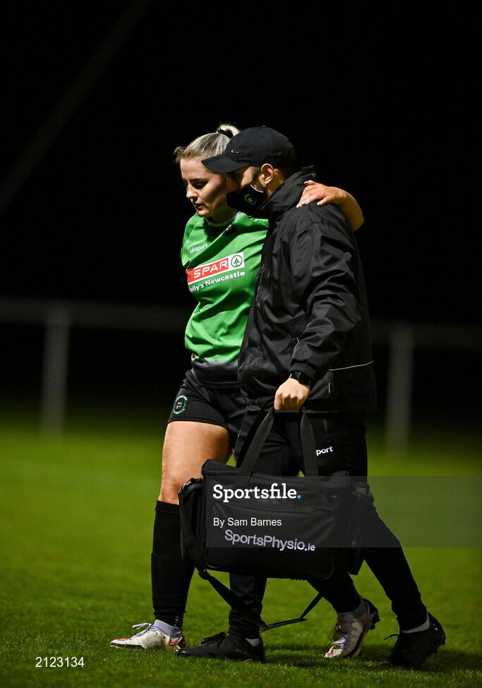 13 November 2021; Louise Masterson of Peamount United leaves the field after picking up an injury during the SSE Airtricity Women's National League match between Peamount United and Galway WFC at PLR Park in Greenogue, Dublin. Photo by Sam Barnes/Sportsfile