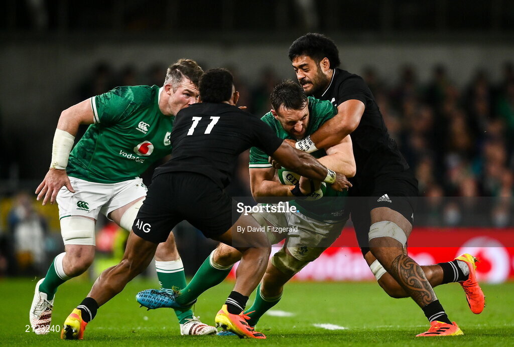 13 November 2021; Jack Conan of Ireland is tackled by Akira Ioane of New Zealand during the Autumn Nations Series match between Ireland and New Zealand at Aviva Stadium in Dublin. Photo by David Fitzgerald/Sportsfile