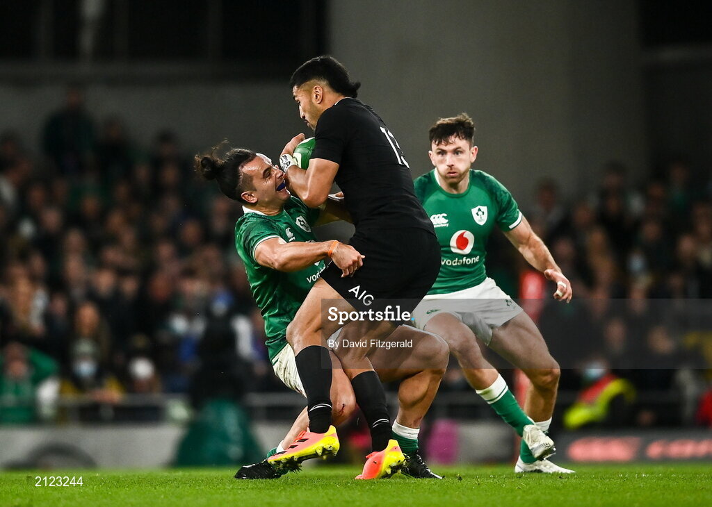 13 November 2021; Rieko Ioane of New Zealand is tackled by James Lowe of Ireland during the Autumn Nations Series match between Ireland and New Zealand at Aviva Stadium in Dublin. Photo by David Fitzgerald/Sportsfile