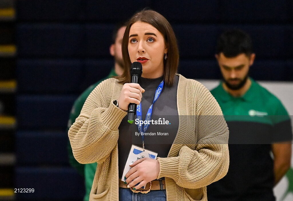 14 November 2021; Niamh Sheehy sings Amhrán na bhFiann before the FIBA Women's EuroBasket 2023 Qualifier Group I match between Ireland and Czech Republic at National Basketball Arena in Tallaght, Dublin. Photo by Brendan Moran/Sportsfile