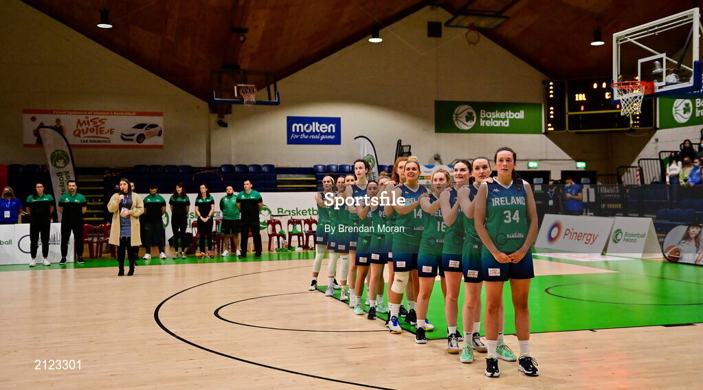 14 November 2021; Niamh Sheehy sings Amhrán na bhFiann before the FIBA Women's EuroBasket 2023 Qualifier Group I match between Ireland and Czech Republic at National Basketball Arena in Tallaght, Dublin. Photo by Brendan Moran/Sportsfile