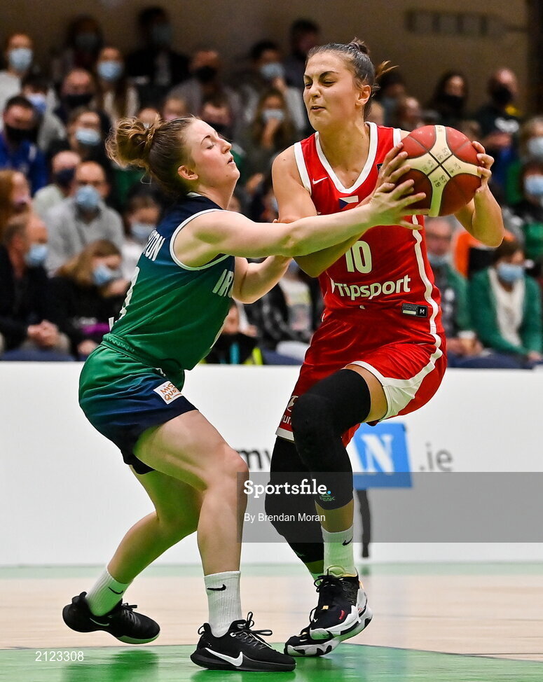 14 November 2021; Eliska Hamzova of Czech Republic in action against Edel Thornton of Ireland during the FIBA Women's EuroBasket 2023 Qualifier Group I match between Ireland and Czech Republic at National Basketball Arena in Tallaght, Dublin. Photo by Brendan Moran/Sportsfile