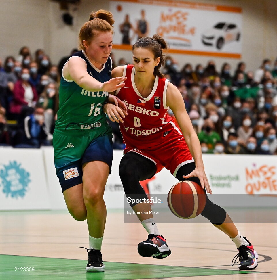 14 November 2021; Veronika Vorackova of Czech Republic in action against Sorcha Tiernan of Ireland during the FIBA Women's EuroBasket 2023 Qualifier Group I match between Ireland and Czech Republic at National Basketball Arena in Tallaght, Dublin. Photo by Brendan Moran/Sportsfile