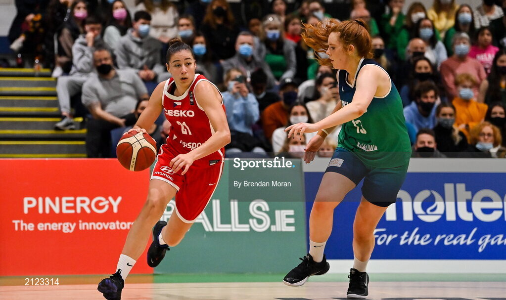 14 November 2021; Veronika Sipova of Czech Republic in action against Claire Melia of Ireland during the FIBA Women's EuroBasket 2023 Qualifier Group I match between Ireland and Czech Republic at National Basketball Arena in Tallaght, Dublin. Photo by Brendan Moran/Sportsfile