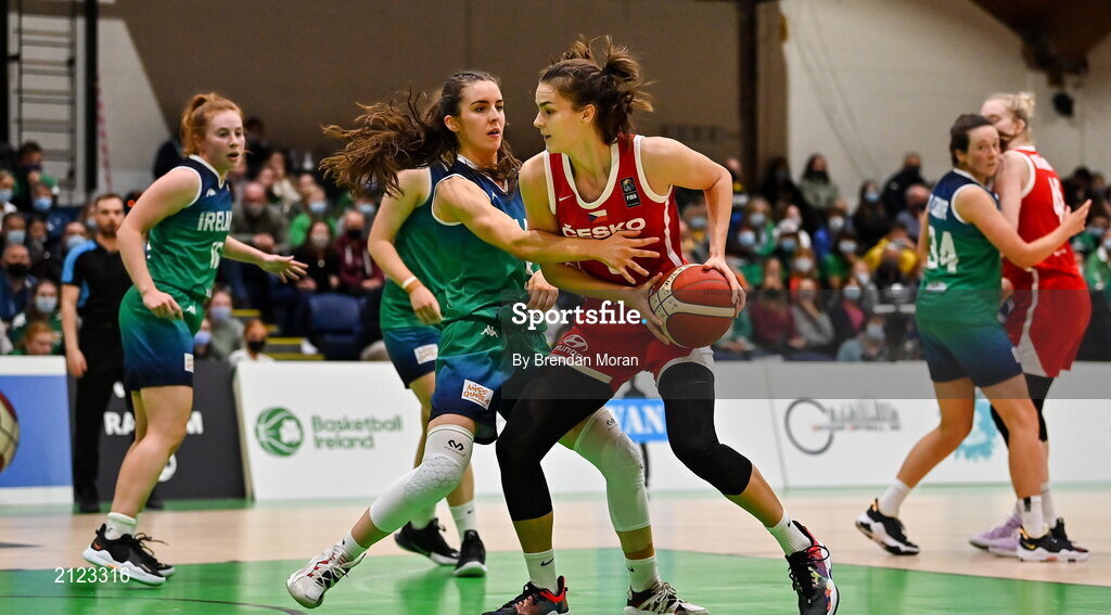 14 November 2021; Veronika Vorackova of Czech Republic in action against Dayna Finn of Ireland during the FIBA Women's EuroBasket 2023 Qualifier Group I match between Ireland and Czech Republic at National Basketball Arena in Tallaght, Dublin. Photo by Brendan Moran/Sportsfile