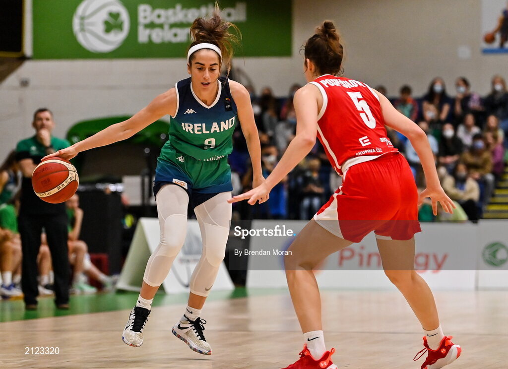 14 November 2021; Grainne Dwyer of Ireland in action against Julie Pospisilova of Czech Republic during the FIBA Women's EuroBasket 2023 Qualifier Group I match between Ireland and Czech Republic at National Basketball Arena in Tallaght, Dublin. Photo by Brendan Moran/Sportsfile