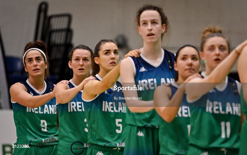 14 November 2021; Joint Ireland team captain Grainne Dwyer, left, stands with her team-mates during the playing of Amhrán na bhFiann before the FIBA Women's EuroBasket 2023 Qualifier Group I match between Ireland and Czech Republic at National Basketball Arena in Tallaght, Dublin. Photo by Brendan Moran/Sportsfile