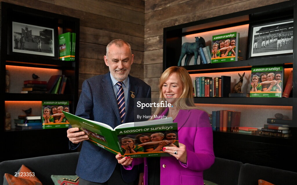 15 November 2021; Uachtarán Chumann Lúthchleas Gael Larry McCarthy and LGFA CEO Helen O’Rourke at the launch of A Season of Sundays 2021 at Croke Park Hotel in Dublin. Photo by Harry Murphy/Sportsfile