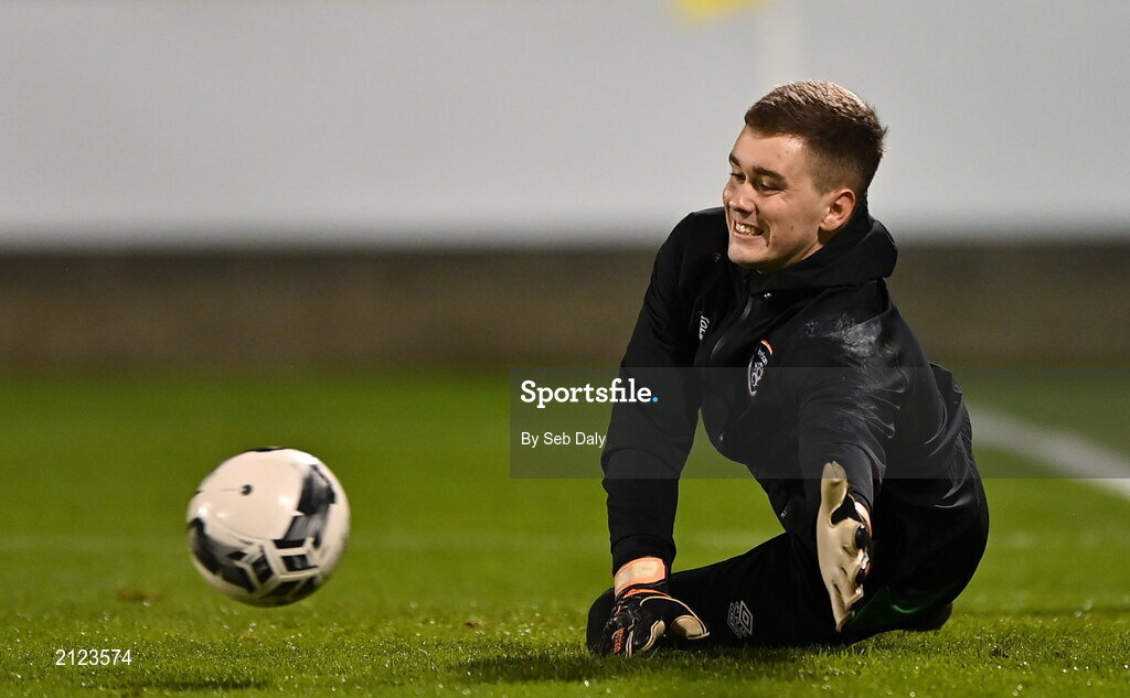 16 November 2021; Republic of Ireland goalkeeper Brian Maher warms up before the UEFA European U21 Championship qualifying group A match between Republic of Ireland and Sweden at Tallaght Stadium in Dublin. Photo by Seb Daly/Sportsfile