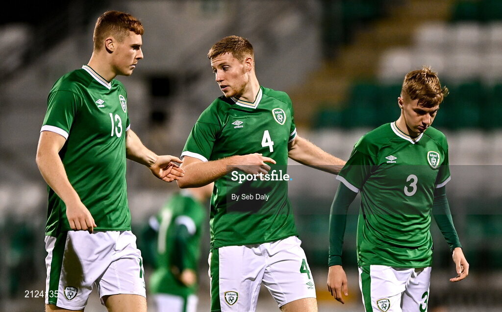 16 November 2021; Republic of Ireland players, from left, Jake O'Brien, Mark McGuinness and Joel Bagan during the UEFA European U21 Championship qualifying group A match between Republic of Ireland and Sweden at Tallaght Stadium in Dublin. Photo by Seb Daly/Sportsfile