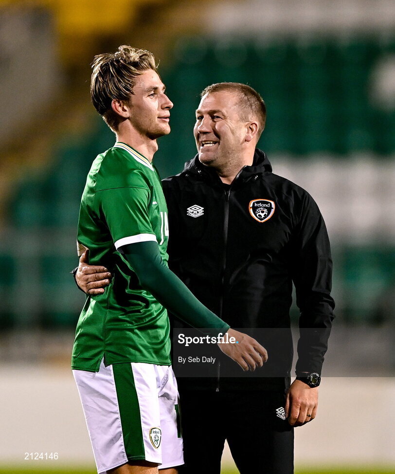 16 November 2021; Oliver O'Neill of Republic of Ireland and assistant coach Alan Reynolds after the UEFA European U21 Championship qualifying group A match between Republic of Ireland and Sweden at Tallaght Stadium in Dublin. Photo by Seb Daly/Sportsfile