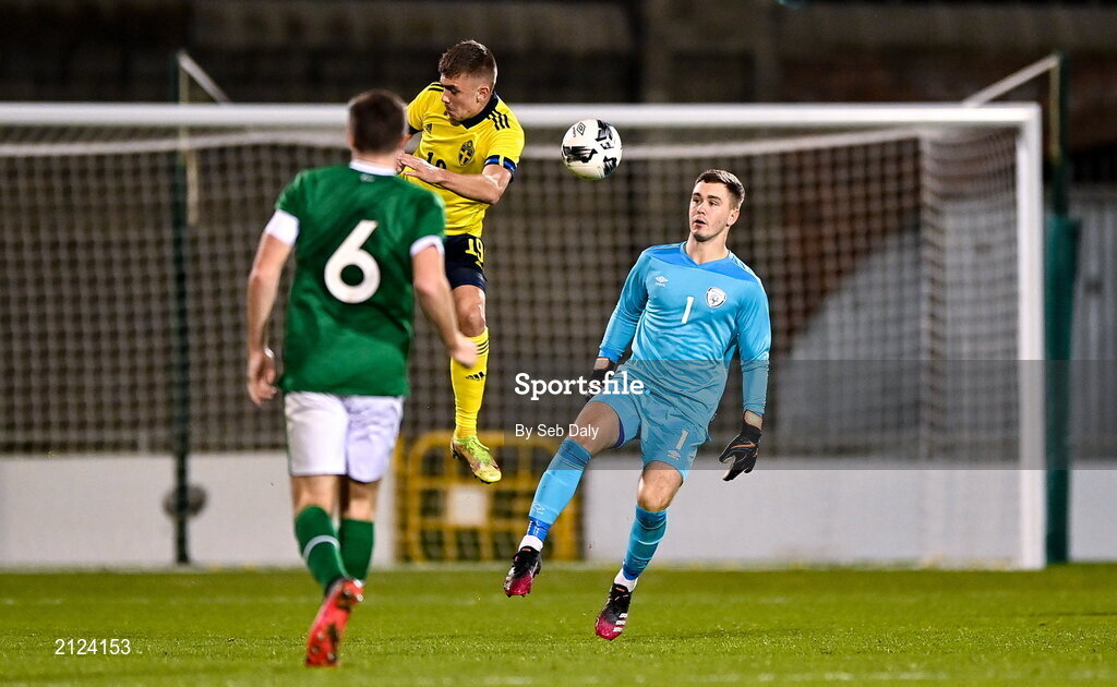 16 November 2021; Republic of Ireland goalkeeper Brian Maher in action against Tim Prica of Sweden during the UEFA European U21 Championship qualifying group A match between Republic of Ireland and Sweden at Tallaght Stadium in Dublin. Photo by Seb Daly/Sportsfile