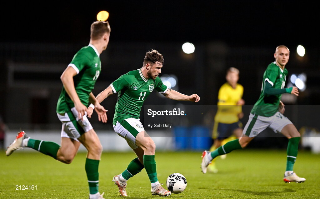 16 November 2021; Will Ferry of Republic of Ireland, centre, supported by team-mates Evan Fergusson, left, and Will Smallbone during the UEFA European U21 Championship qualifying group A match between Republic of Ireland and Sweden at Tallaght Stadium in Dublin. Photo by Seb Daly/Sportsfile