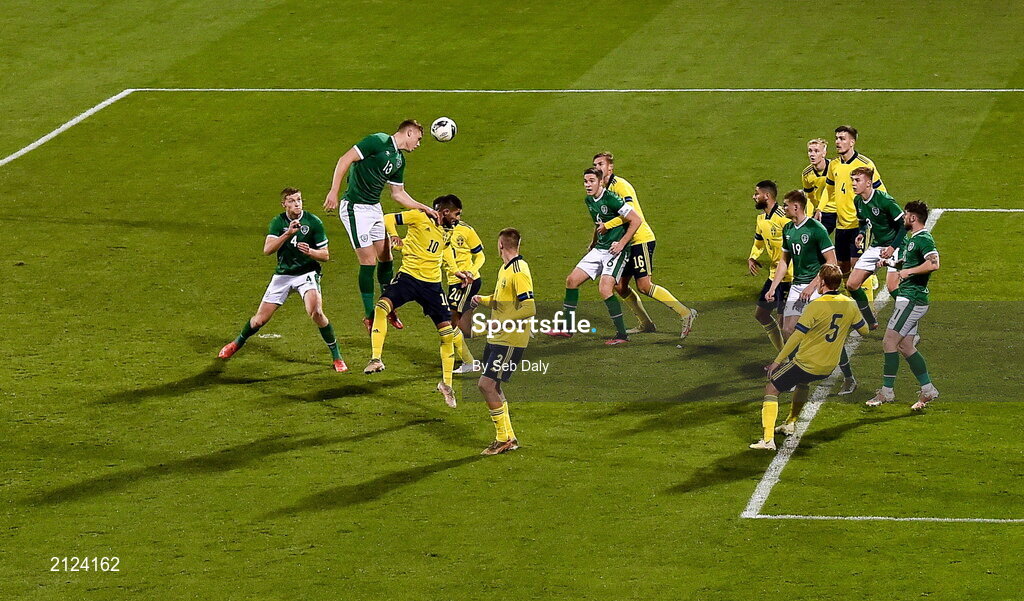 16 November 2021; Jake O'Brien of Republic of Ireland in action against Rami Al Hajj of Sweden during the UEFA European U21 Championship qualifying group A match between Republic of Ireland and Sweden at Tallaght Stadium in Dublin. Photo by Seb Daly/Sportsfile