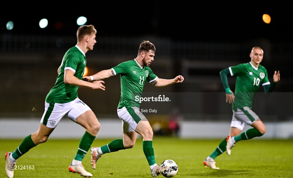 16 November 2021; Will Ferry of Republic of Ireland, centre, supported by team-mates Evan Fergusson, left, and Will Smallbone during the UEFA European U21 Championship qualifying group A match between Republic of Ireland and Sweden at Tallaght Stadium in Dublin. Photo by Seb Daly/Sportsfile