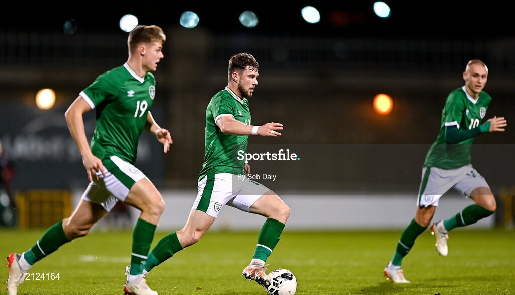 16 November 2021; Will Ferry of Republic of Ireland, centre, supported by team-mates Evan Fergusson, left, and Will Smallbone during the UEFA European U21 Championship qualifying group A match between Republic of Ireland and Sweden at Tallaght Stadium in Dublin. Photo by Seb Daly/Sportsfile