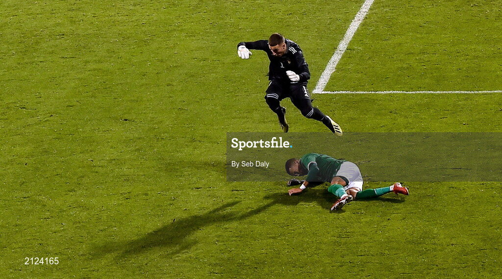 16 November 2021; Samuel Brolin of Sweden in action against Tyreik Wright of Republic of Ireland during the UEFA European U21 Championship qualifying group A match between Republic of Ireland and Sweden at Tallaght Stadium in Dublin. Photo by Seb Daly/Sportsfile