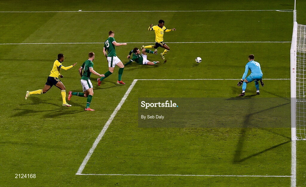 16 November 2021; Anthony Elanga of Sweden in action against Lee O'Connor of Republic of Ireland during the UEFA European U21 Championship qualifying group A match between Republic of Ireland and Sweden at Tallaght Stadium in Dublin. Photo by Seb Daly/Sportsfile