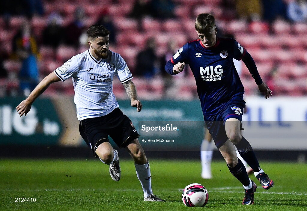 5 November 2021; Chris Forrester of St Patrick's Athletic and Adam McDonnell of Sligo Rovers during the SSE Airtricity League Premier Division match between St Patrick's Athletic and Sligo Rovers at Richmond Park in Dublin. Photo by Ben McShane/Sportsfile