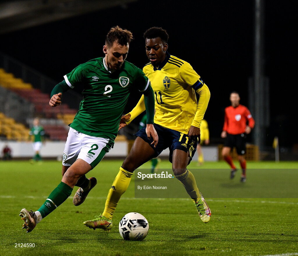 16 November 2021; Lee O'Connor of Republic of Ireland in action against Anthony Elanga of Sweden during the UEFA European U21 Championship qualifying group A match between Republic of Ireland and Sweden at Tallaght Stadium in Dublin. Photo by Eóin Noonan/Sportsfile