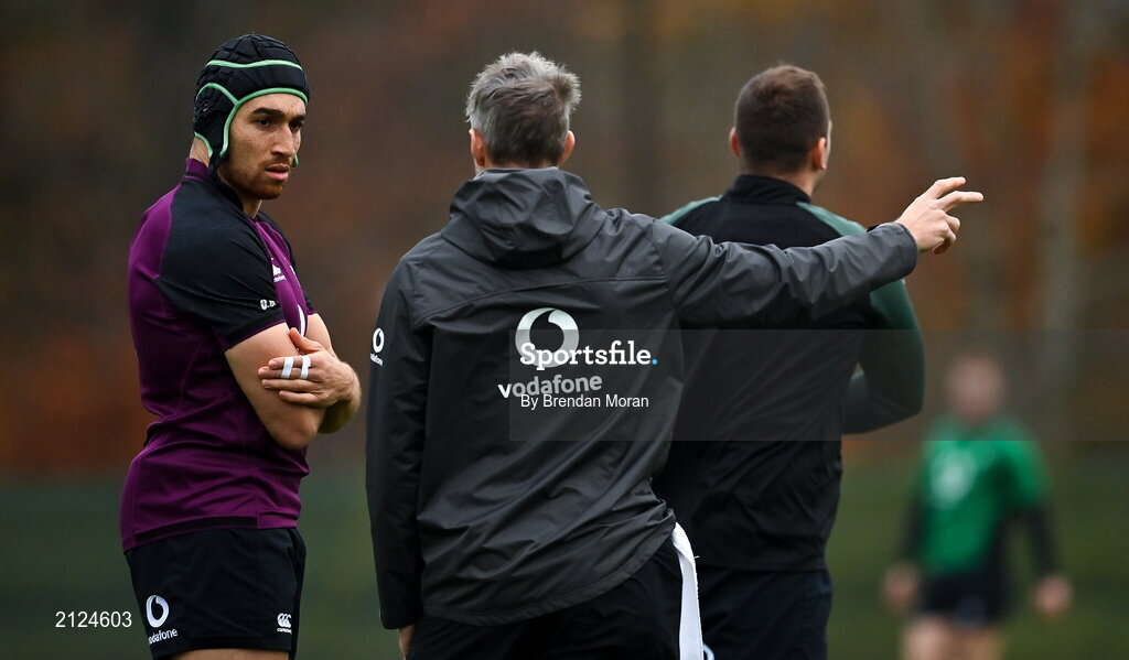 18 November 2021; Ultan Dillane, left, with defence coach Simon Easterby during Ireland rugby squad training at Carton House in Maynooth, Kildare. Photo by Brendan Moran/Sportsfile