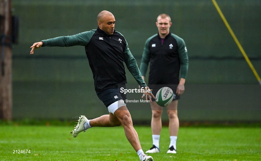18 November 2021; Simon Zebo, left, and Keith Earls during Ireland rugby squad training at Carton House in Maynooth, Kildare. Photo by Brendan Moran/Sportsfile