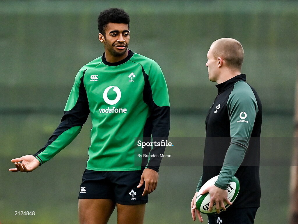 18 November 2021; Robert Baloucoune, left, with Keith Earls during Ireland rugby squad training at Carton House in Maynooth, Kildare. Photo by Brendan Moran/Sportsfile